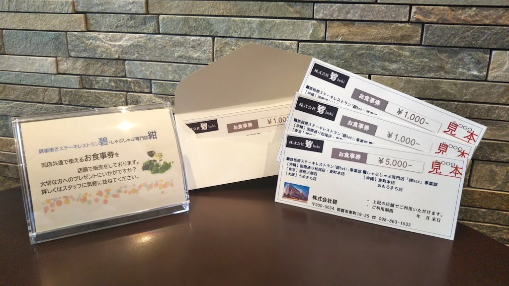 ご購入はしゃぶしゃぶ紺kouと、姉妹店の鉄板焼ステーキレストラン碧heki全店舗で行えます。店舗スタッフに食事券を購入したい旨をお申し付けください。